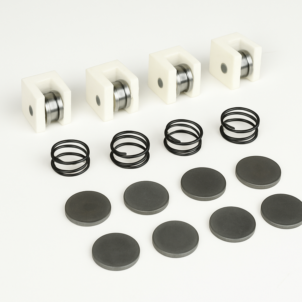A damaged wheel or weak spring can cause binding, poor tracking, uneven movement, or failure to return to position. Replacing the complete kit ensures the wheel rolls smoothly while the spring provides the correct tension for reliable performance.